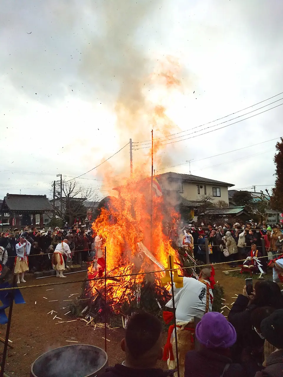 火伏まつりに先立って、本堂で新しい年の無事や息災を不動明王に祈る護摩祈祷(初不動)が行われた。護摩壇の炎を囲む僧と山伏が唱える真言、手鈴杖を振って鳴らすシャクシャクという音、リズミカルな太鼓の響き—一宗教儀式が醸すちょっと神秘的な空気を味わった。