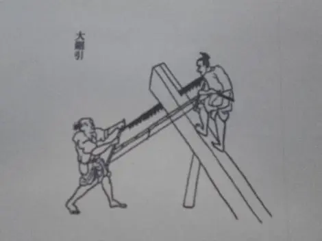 大鋸引は、二人一組で大型の縦挽き鋸を使って製材する職人で、大鋸とは、本来この鋸のことを指している。大鋸は大陸から渡来し、十五世紀に普及すると、製材精度は飛躍的に向上した。このことから、戦国大名北条氏から大鋸引と呼ばれ、重用された。